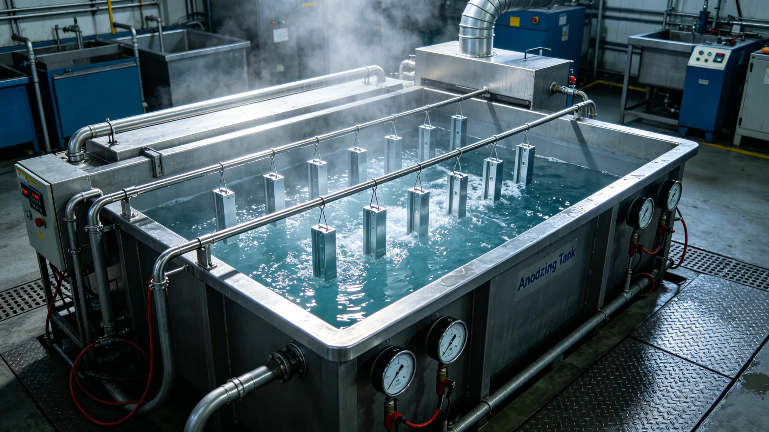Complete anodizing system for aluminum parts. Creates a hard, protective oxide layer that improves corrosion resistance, wear resistance, and surface durability. We offer clear, black, and colored anodizing options to meet different aesthetic and functional requirements.